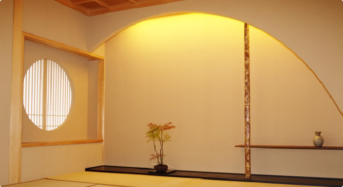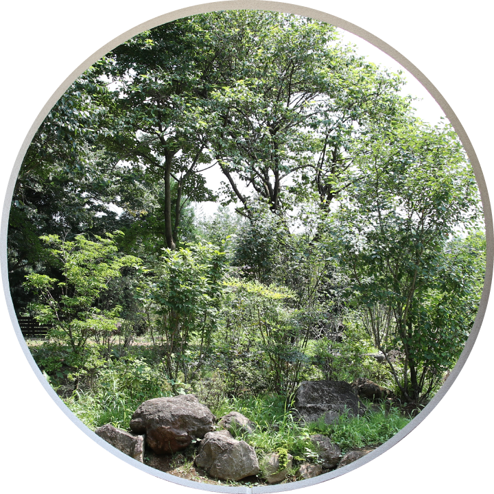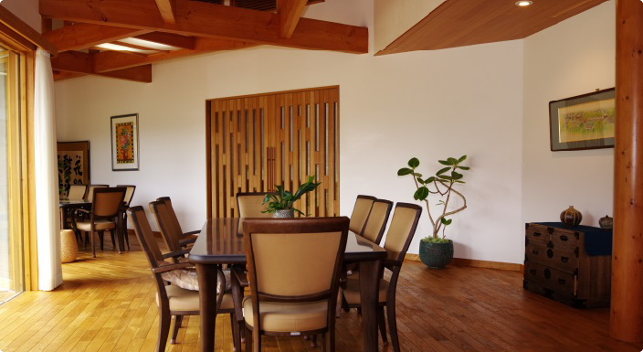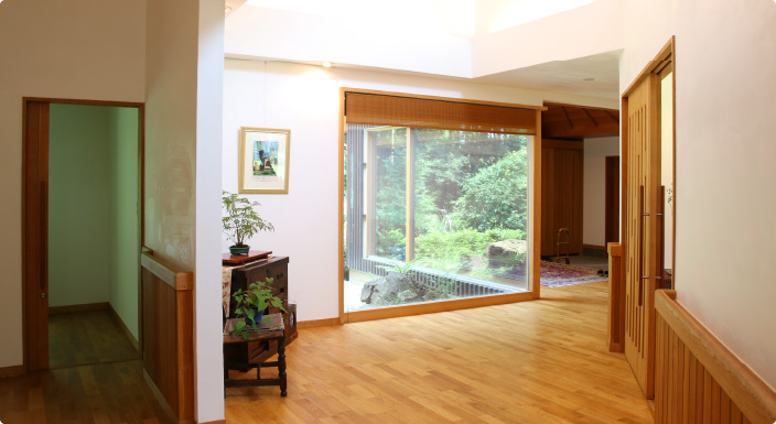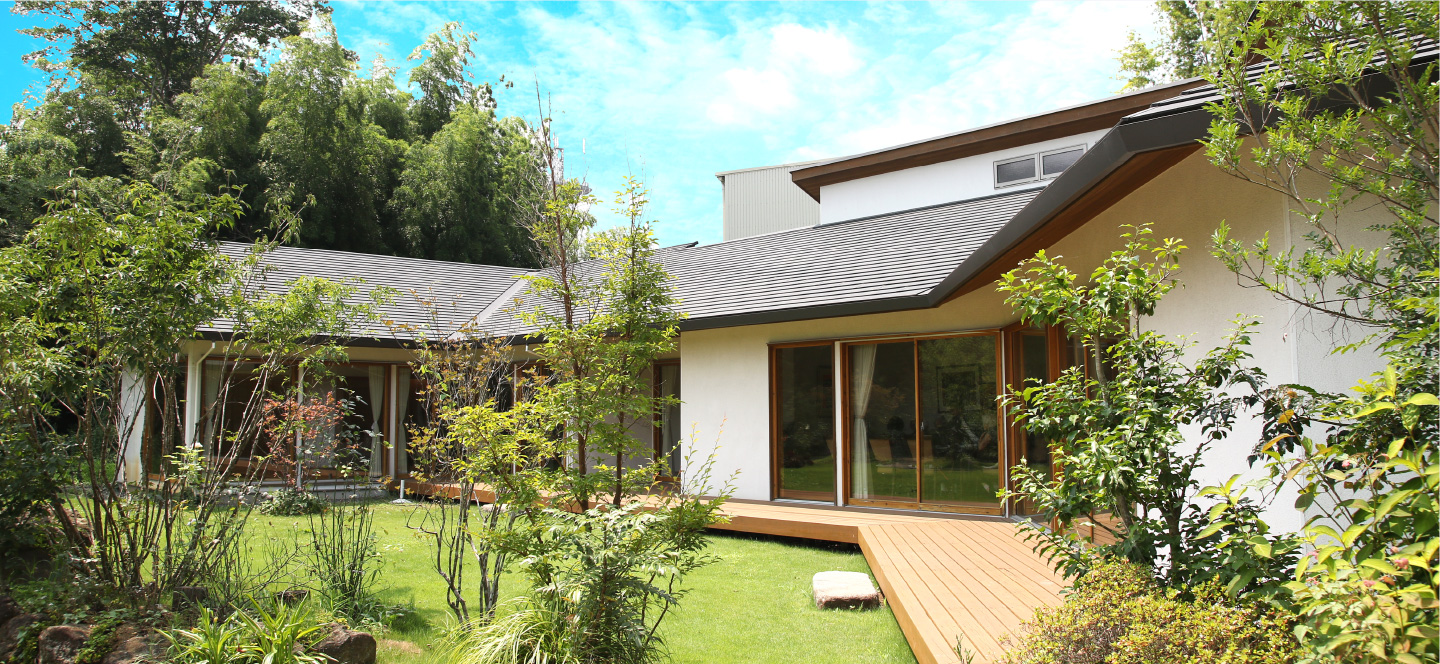 緑に囲まれた広々とした庭園の中に純和風の日本家屋で木の香り漂う